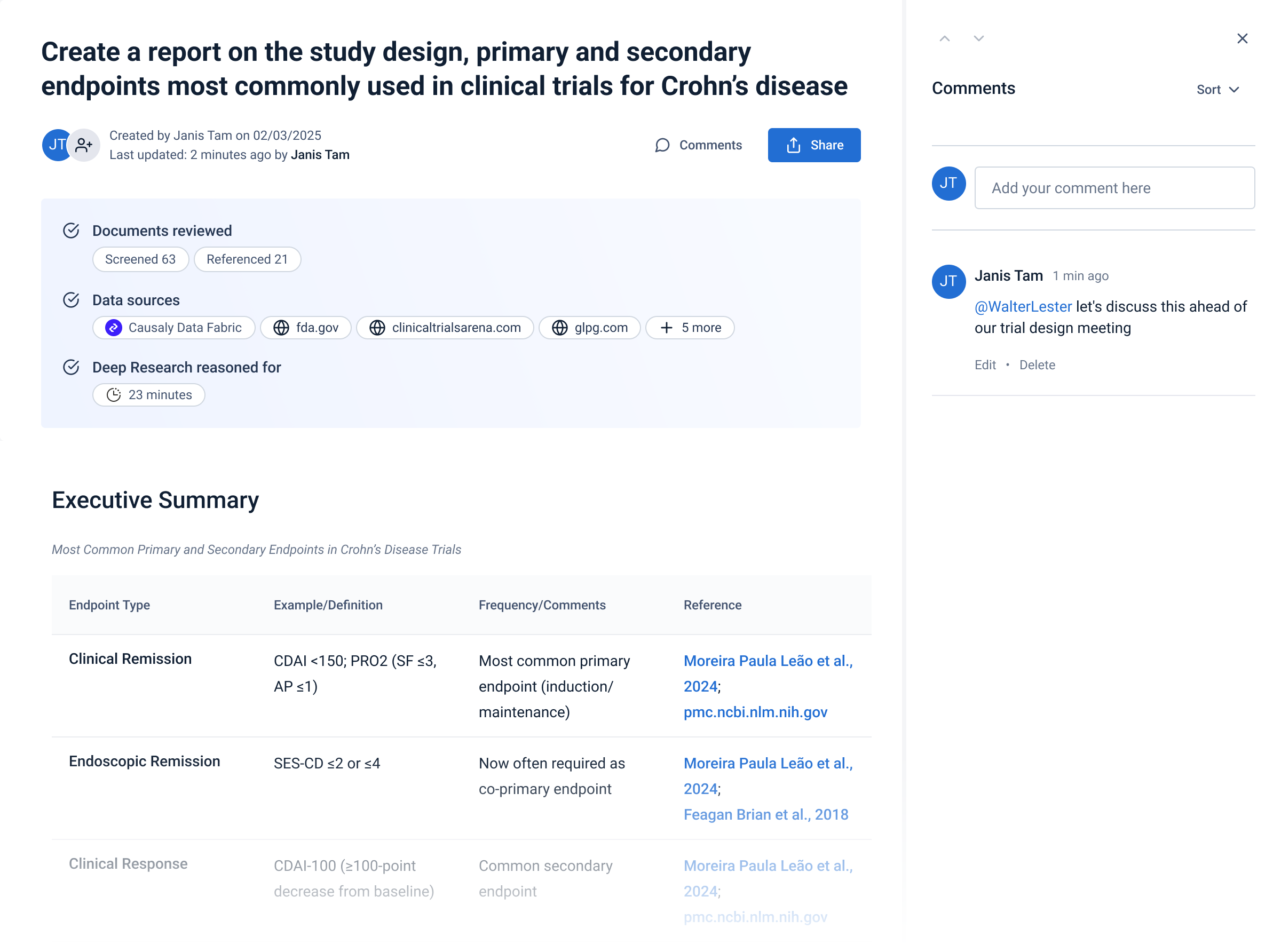 - Dynamic reports: Deep Research reports are not static documents. They are living artifacts that automatically update as new, relevant evidence surfaces in the scientific landscape. This proactive updating keeps your research on the leading edge and guarantees that insights are generated based on the most up-to-date information landscape available.