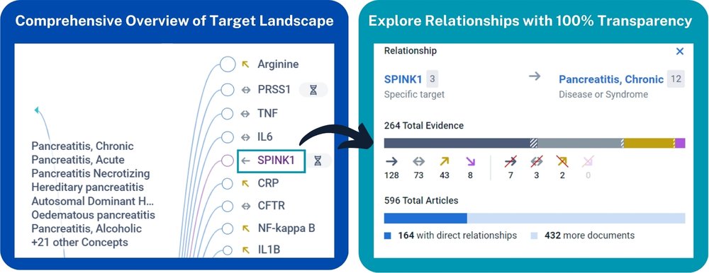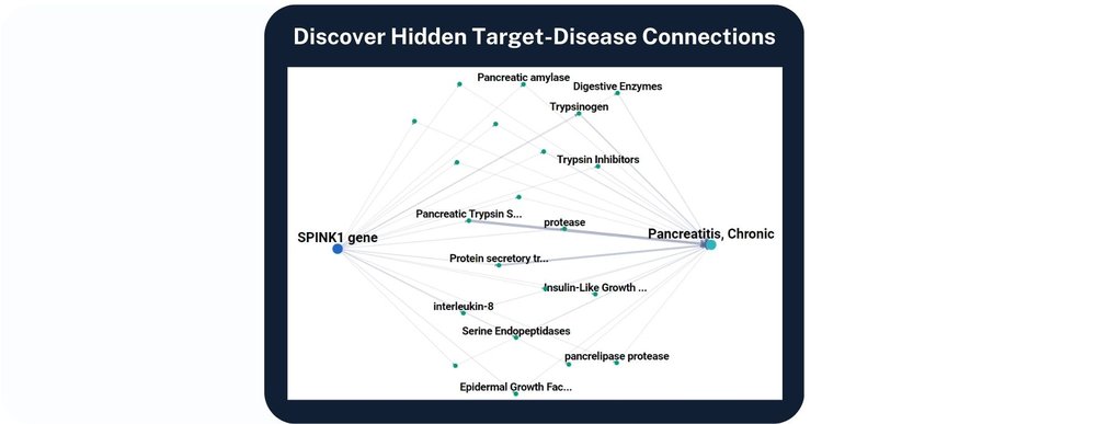 By machine-reading the entire volume of biomedical literature, more than 1,400 targets associated with chronic pancreatitis were uncovered. Results can be visualized as a dendrogram of results, allowing users to peruse evidence for the target-disease relationship.