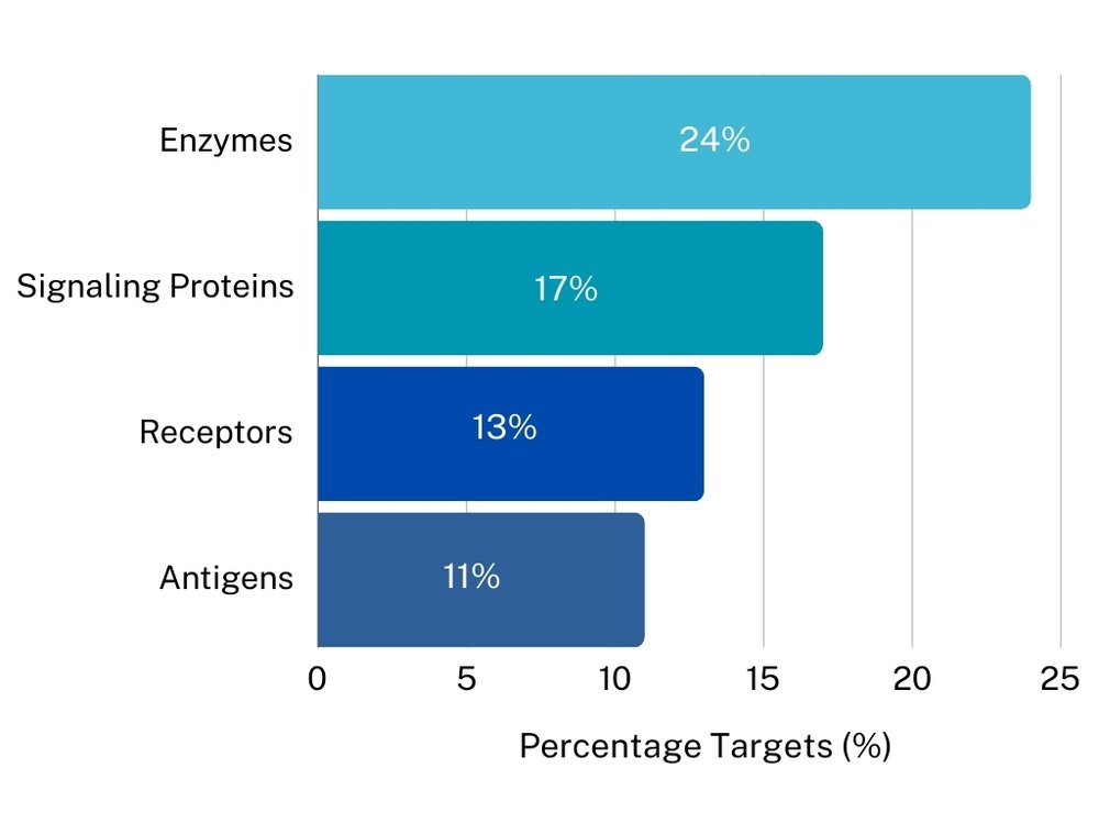 Around one quarter of the targets identified by Icobber were enzymes, Figure 1. Filtering further by those reported in the last 5 years (2019-2024) revealed that the most studied subclass of enzymes to be hydrolases (45%), transferases (34%) and oxidoreductases (14%).