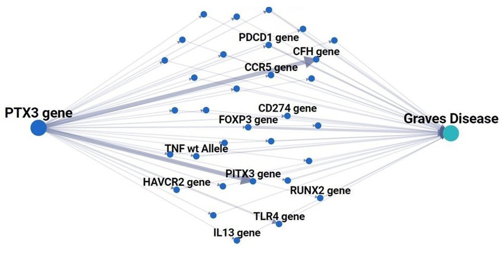 Further prioritization by evidence strength enabled the identification and subsequent exploration of pentraxin 3 (PTX3). By utilizing the mult-hop module, more than 30 genes were shown to indirectly link PTX3 with Graves’ disease. Here, Toll-like receptor 4 (TLR4) was selected as an example.